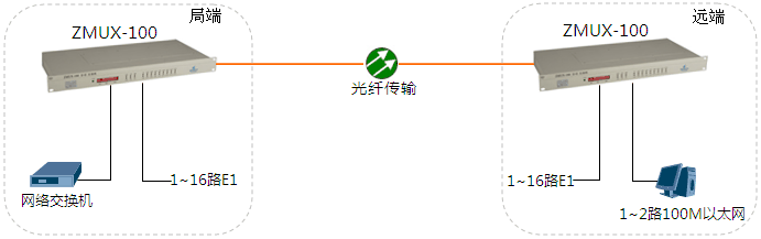 局端站與遠(yuǎn)端站間通過光纖點(diǎn)對(duì)點(diǎn)通訊。局端站1~16路E1接口(2M接口)及1~2路共享速率100M以太網(wǎng)接入到ZMUX-100后轉(zhuǎn)換成光信號(hào),再連接上光纖傳輸?shù)綄?duì)端站還原出來。