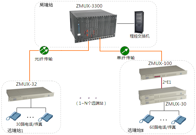 遠(yuǎn)端N的ZMUX-30接入60路電話(可選配其它業(yè)務(wù))復(fù)用成2路E1信號(hào),通過E1接口(2M接口)級(jí)聯(lián)ZMUX-100,再轉(zhuǎn)換成光信號(hào),通過光纖傳輸?shù)綄?duì)端去。